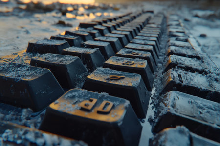 Frost-covered keyboard keys lay scattered on a surface, glistening under soft morning sunlight. The cold air enhances the beauty of the frozen design, creating an intriguing contrast of technology and nature.