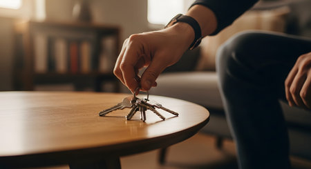 A close-up shot of a man's hand picking up a bunch of keys from a round wooden coffee table in a modern living room. The person is preparing to leave the house or has just arrived, symbolizing transition and routine.