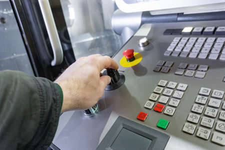 The worker switches the buttons on the remote control of the CNC machine, the control of the processing center.
