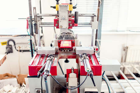 Factory for aluminum and PVC windows and doors production. Details industrial equipment.The process of manufacturing plastic window frames