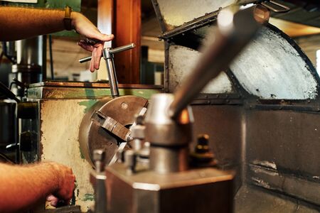 Turner is working on a turning lathe at the metal constructions factory. Metal industry