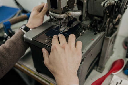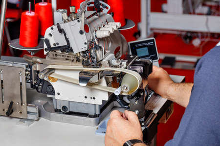 Sewing production, hands and craftsmen set up a modern electric sewing machine and check the quality of its work.
