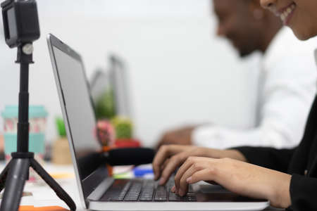 Young confident businesswoman sitting at the office table with of colleague in the background, working on laptop computer. Job and technology concept. Focus on hand.