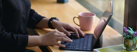 Top view of male hands typing on tablet keyboard on black table with coffee cup and copy space