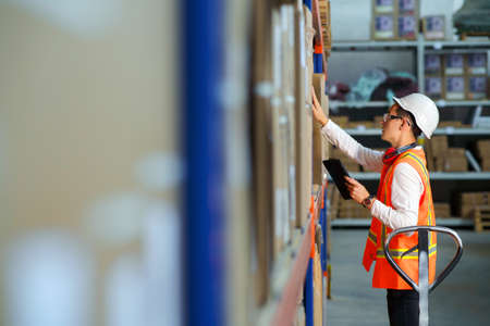 Warehouse workers checking stock in a large warehouse. This is a freight transportation and distribution warehouse. Industrial and industrial workers concept
