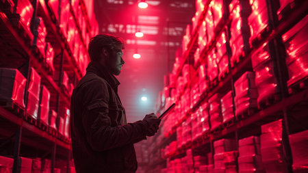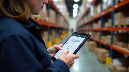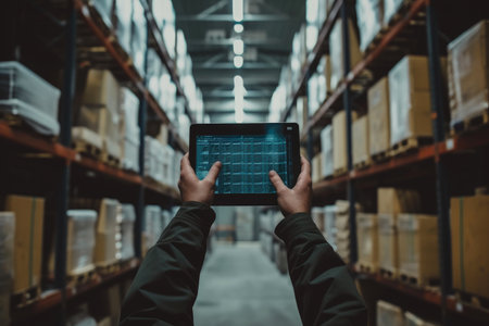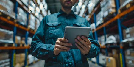 warehouse worker using digital tablet for inventory management in a modern warehouse