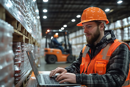 A warehouse worker diligently types on a laptop, surrounded by shelves of stacked boxes.
