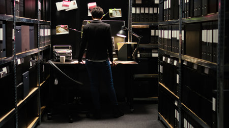 Asian private investigator in agency depository office room looking for criminal case file paperwork on cabinet shelves. Detective woman and elderly assistant coworker surrounded by criminology folders