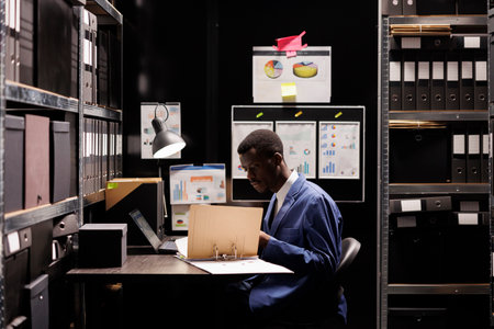 African american manager checking administrative files, analyzing bureaucracy record late at night in arhive room. Corporate worker in formal suit organizing accountancy documents. Depository concept
