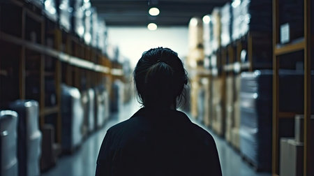 Female warehouse worker inspecting inventory with a tablet in an industrial aisle, symbolizing logistics and modern labor.
