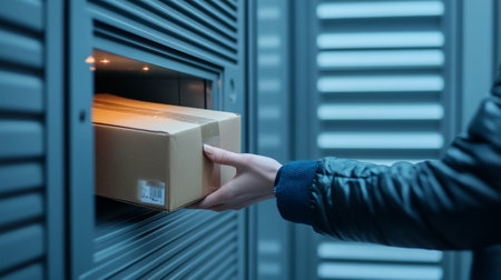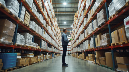 A man is working in a warehouse, surrounded by boxes and shelves. The atmosphere is busy and industrial, with the man focused on his task