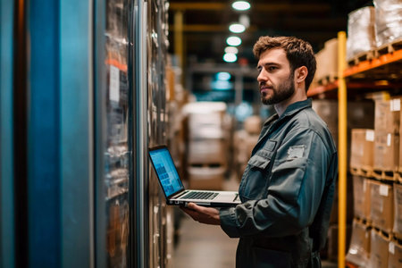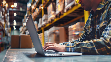 A warehouse worker diligently works on a laptop amidst towering shelves filled with boxes, managing inventory in a busy distribution center.