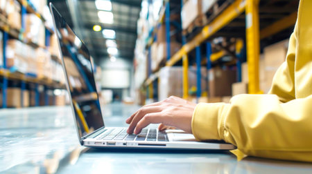 A warehouse workers hands type on a laptop, amidst rows of stacked boxes in a bustling warehouse setting.