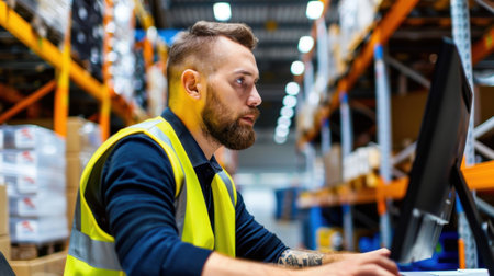 A focused male warehouse worker in a safety vest operates a computer in a busy distribution center, showcasing a modern work environment and dedication to efficiency.