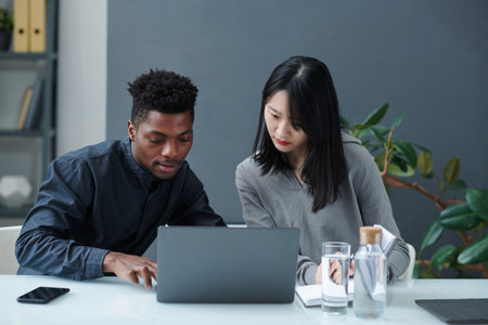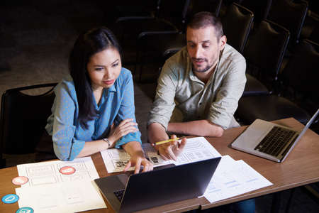 Young colleagues sitting at table together and working online on laptop, they working over online presentation in team