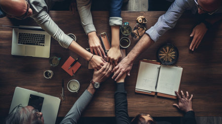 Confident business team holding hands together while sitting at the desk in office : Generative AI