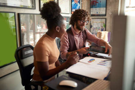 Young man is showing a tablet content to his female colleague while sitting at workplace in a relaxed atmosphere in the office together. Employees, office, work