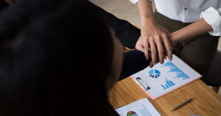 Top view on a group of businessman and businesswoman having a meeting and making a business commitment.