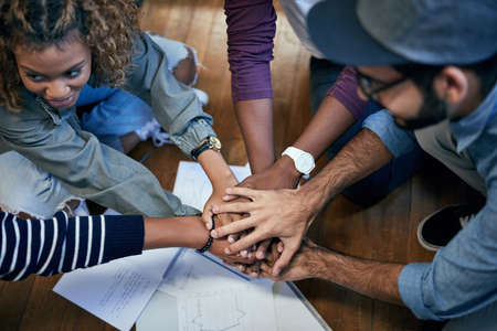 Diverse team of different mixed race business people putting their hands together as they gather for a meeting around an office table. Close up shot of human hands. Union, teamwork, diversity concepts