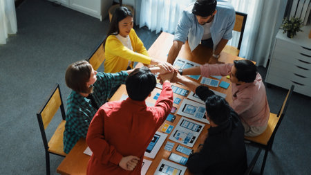Top view of diverse business team putting hand together and clapping hand while brainstorming marketing idea or creative startup project by using sticky notes and stick at meeting table. Convocation.