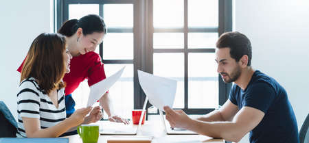 Latin people or office workers using computer and discuss about business project.Teamwork concept in Latin America