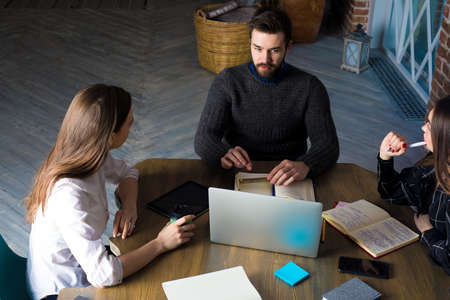 Teamwork of successful business content writers, talking about work, using laptop computer. Students learning online in university library. CEO having interview with new employees sitting in office