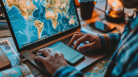 Travel planning with digital tools on world map background