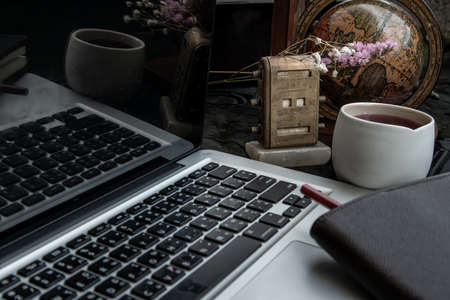 Workplace side view with laptop screen, keyboard, globe, desktop calendar, flower, fruit juice mug and notebook with pencil at office workplace. Creative concept. Blogger's decorated workspace. Selective focus.