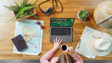 Top view of young woman with laptop and maps planning vacation trip holiday, desktop travel concept.