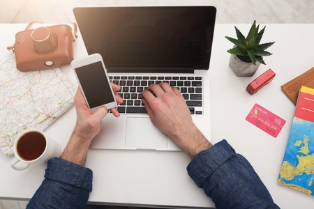 Travel and modern technologies background, tourism and wanderlust concept. Unrecognizable man using smartphone and typing on laptop, searching for hotel, planning vacation, copy space