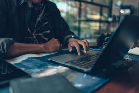 A man using smart phone and computer.modern life,workplace,cross process,coffee shop