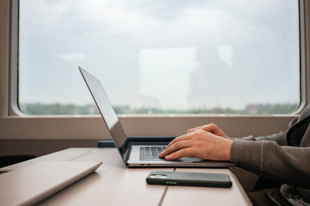 Mens hands type on the keyboard of a silya laptop on a train. European trains, travel, smartphone. Digital work, digital nomad. High quality photo