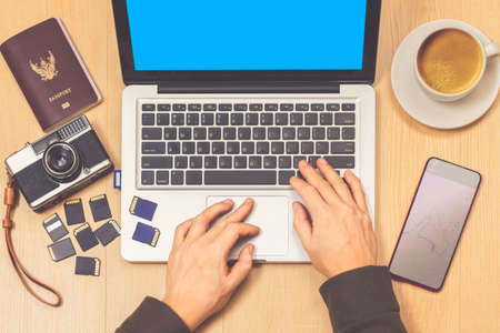 male traveler, photographer searching information, booking hotel on internet and preparing photography equipment for planning vacation trip