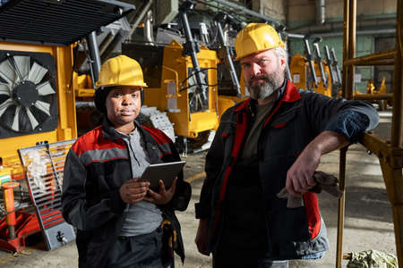 Portrait of couple of technicians looking at camera while standing in warehouse, they controlling the machines with digital tablet