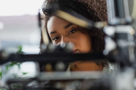close up view of african american woman looking at blurred 3D printer in office