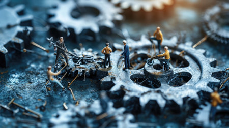 Miniature Workers Operating on Interlocking Mechanical Gears for Industry and Teamwork Concept