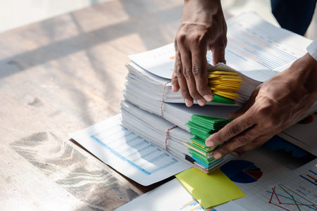 Businessman sorting stacks of department meeting papers, document management in corporate office. Office document management and storage concept.