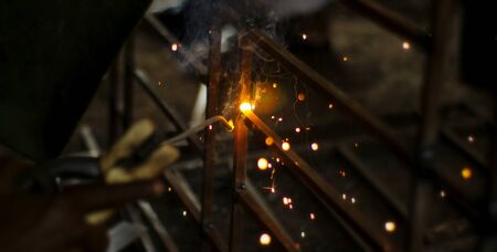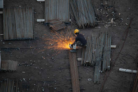 Worker labor welding wire metal with fire spark for building and reinforcement steel stand without using hand glove