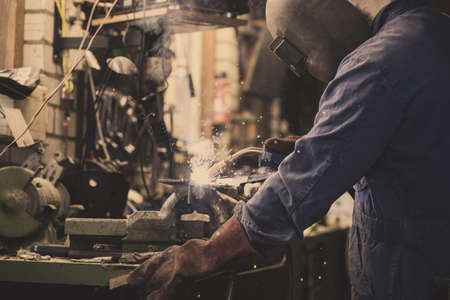 Handyman performing welding and grinding at his workplace in the workshop, while the sparks fly all around him. He is wearing a protective helmet and equipment.