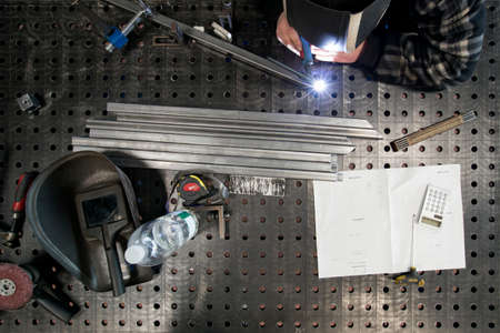 A metal worker welding different metal parts on a table according instructions.