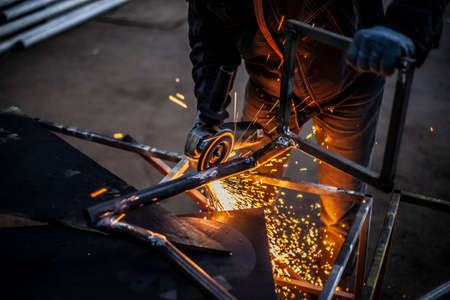 Worker cutting metal with grinder. Sparks while grinding iron.