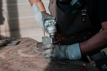 Close up Locksmith works with grinder machine, fly bright sparks.