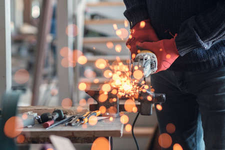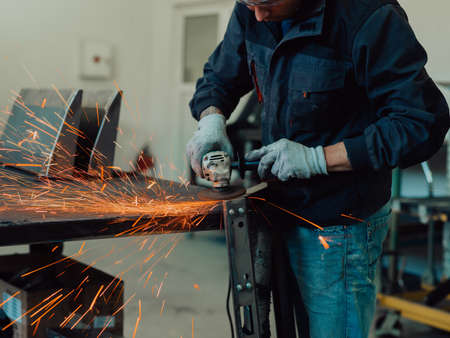 Manual worker using grinder to cut metallic detail in the workshop