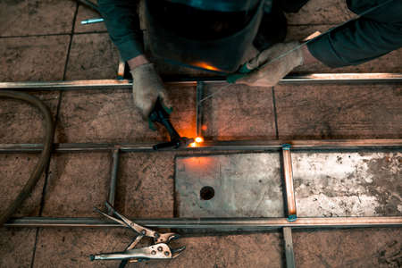 Welder is welding a metal pipe on the workbench.