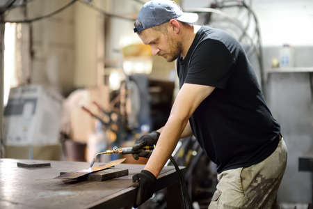 Professional worker in protective clothes, glasses and gloves welding metal at workshop. Caucasian man working with hot steel at forge. Concept of manufacture and manual work.