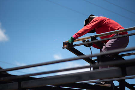 Worker welding the roof steel in construction site, Close up.