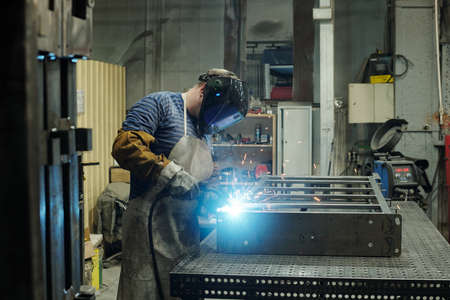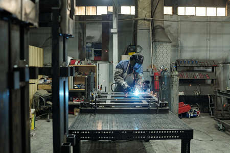 Side view of male worker of huge industrial plant or manufactory bending over large metallic workbench while carrying out welding work