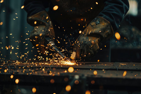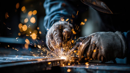 A dynamic close-up captures a craftsman welding metal in an industrial workshop, showcasing flying sparks and the skilled hands of a worker in protective gear.