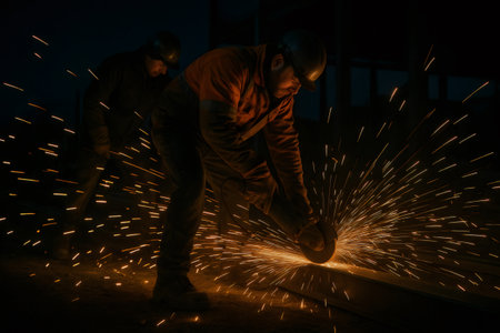 Construction worker wearing safety helmet and workwear cutting steel beam at night with angle grinder creating sparks