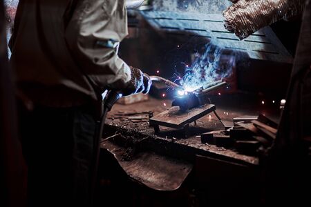 welder is welding metal part in garage. with protective mask, industrial steel welder